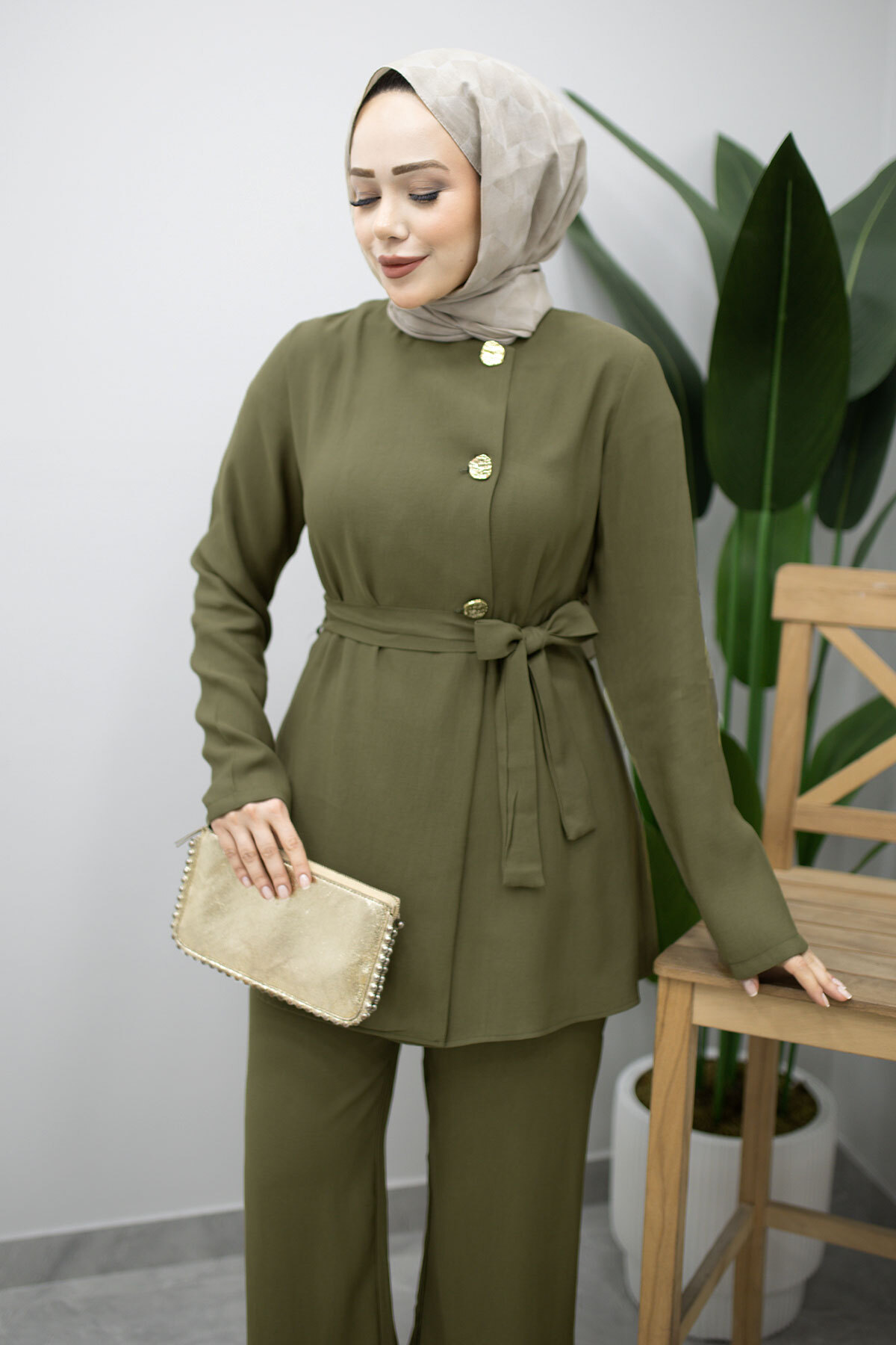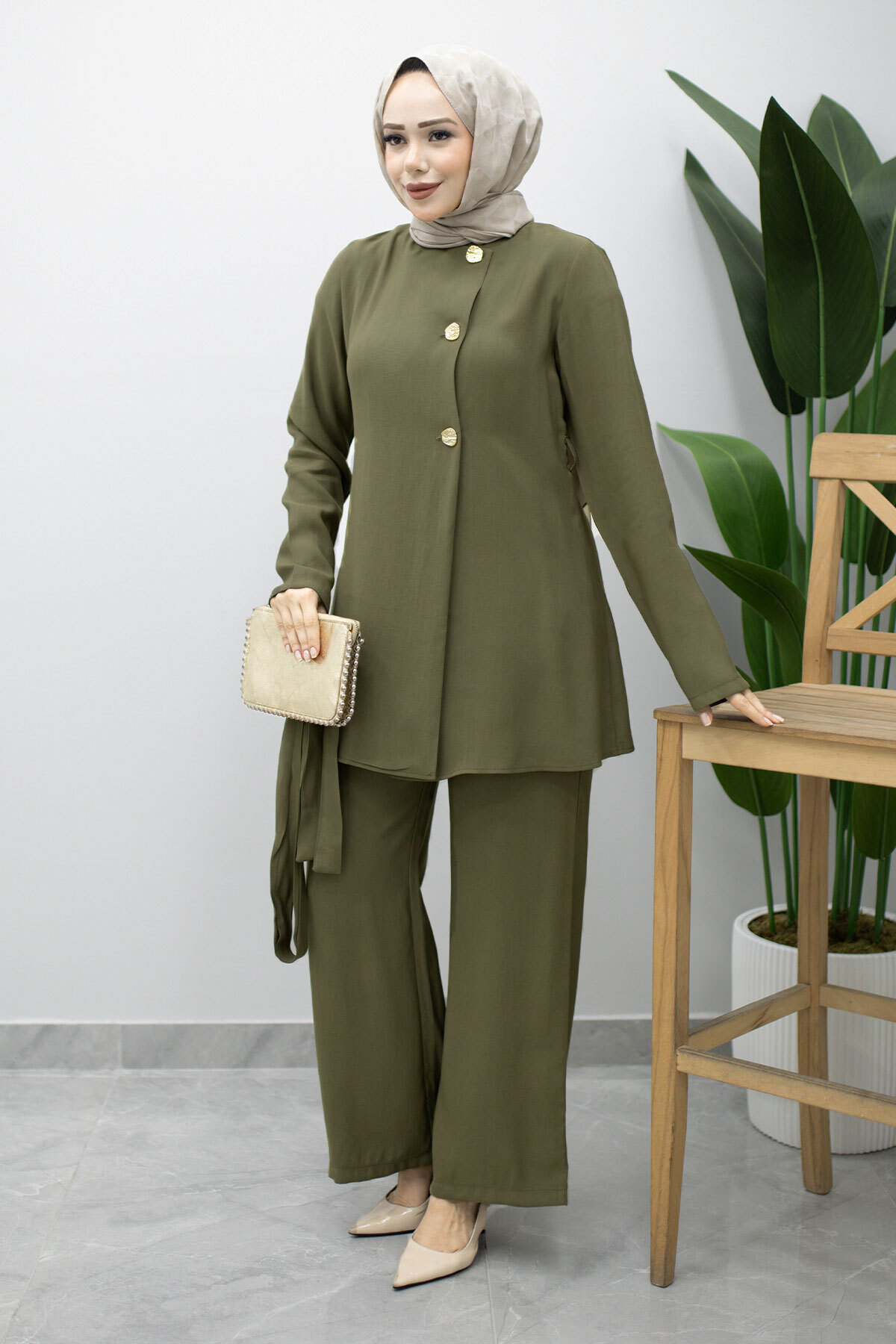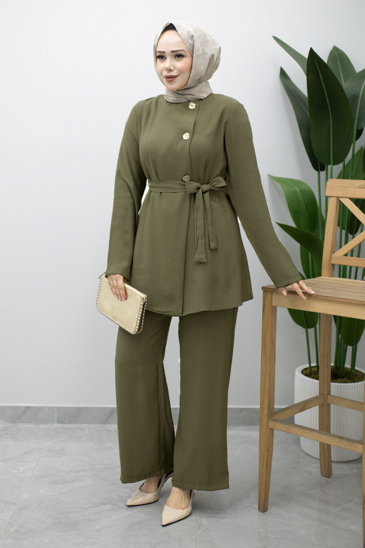 Düğmeli Beli Kuşaklı İkili Takım TSD260200 Haki