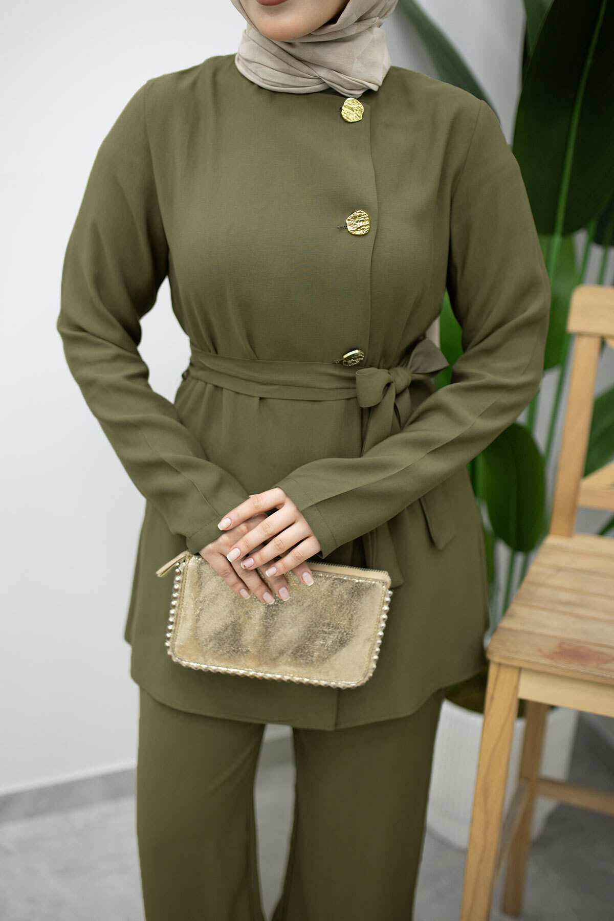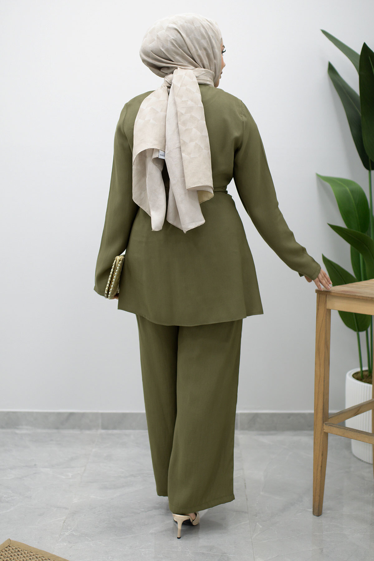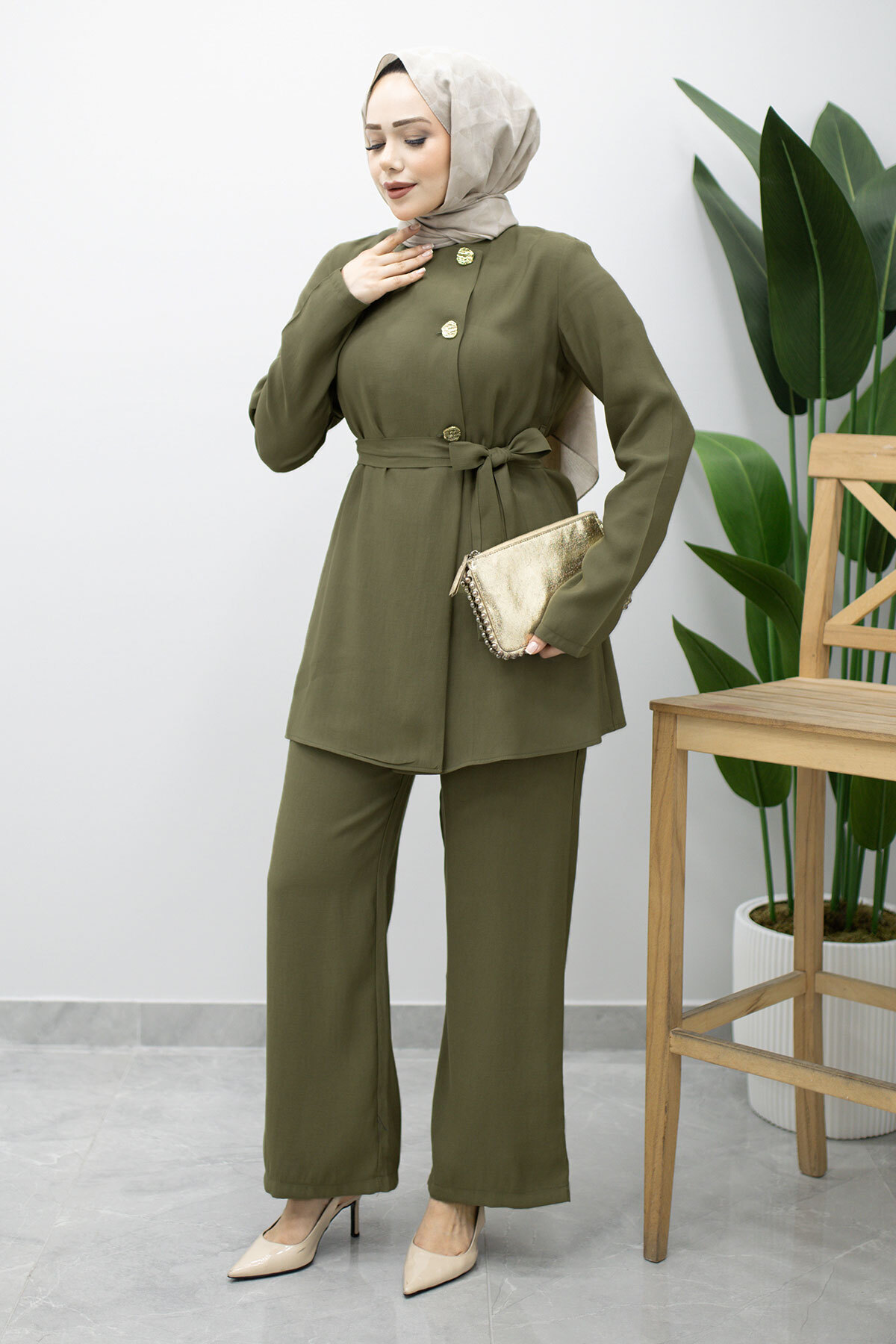 Düğmeli Beli Kuşaklı İkili Takım TSD260200 Haki