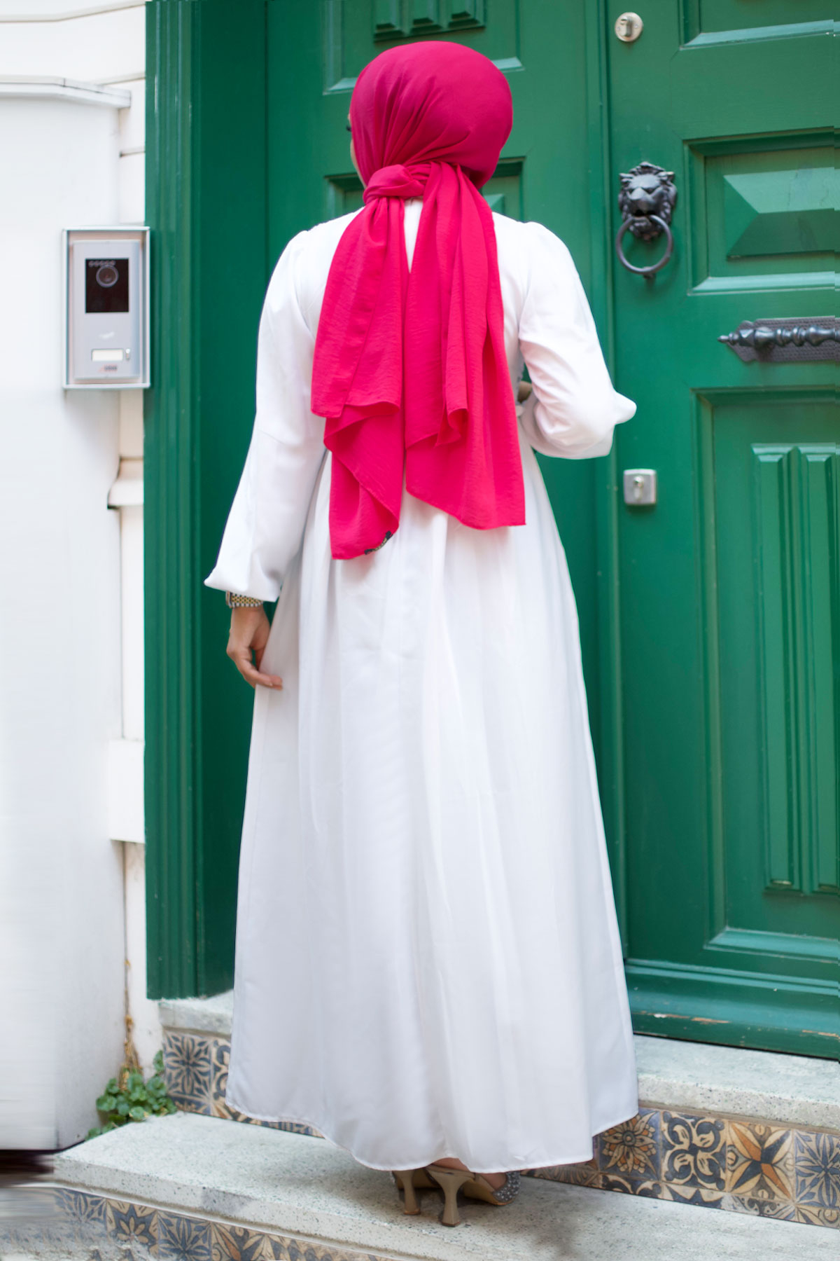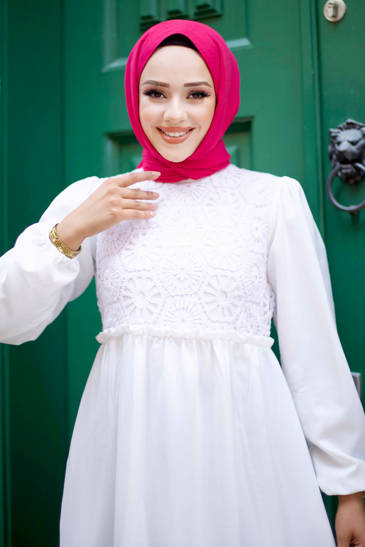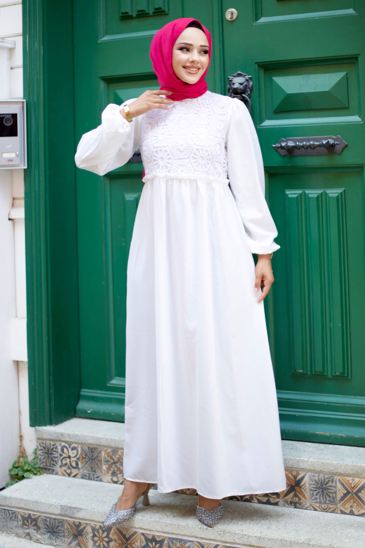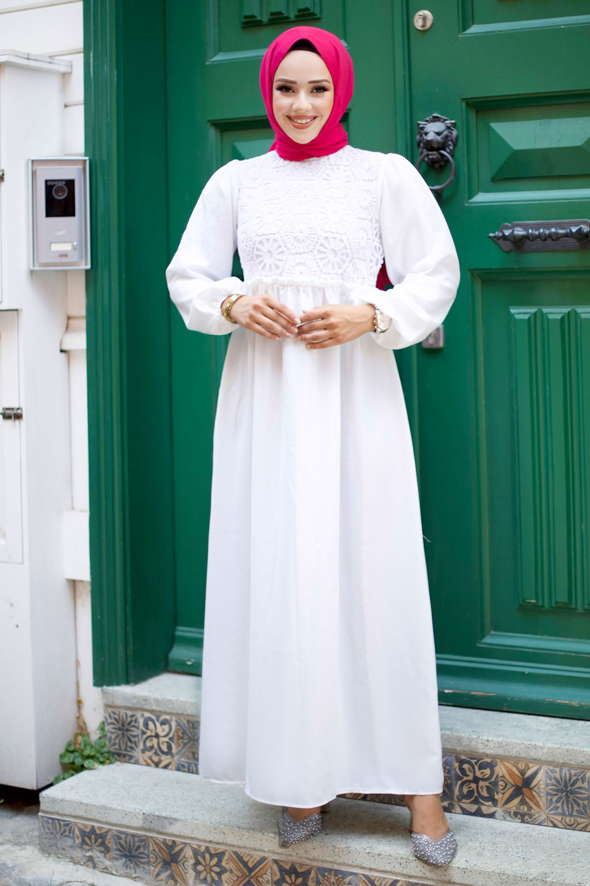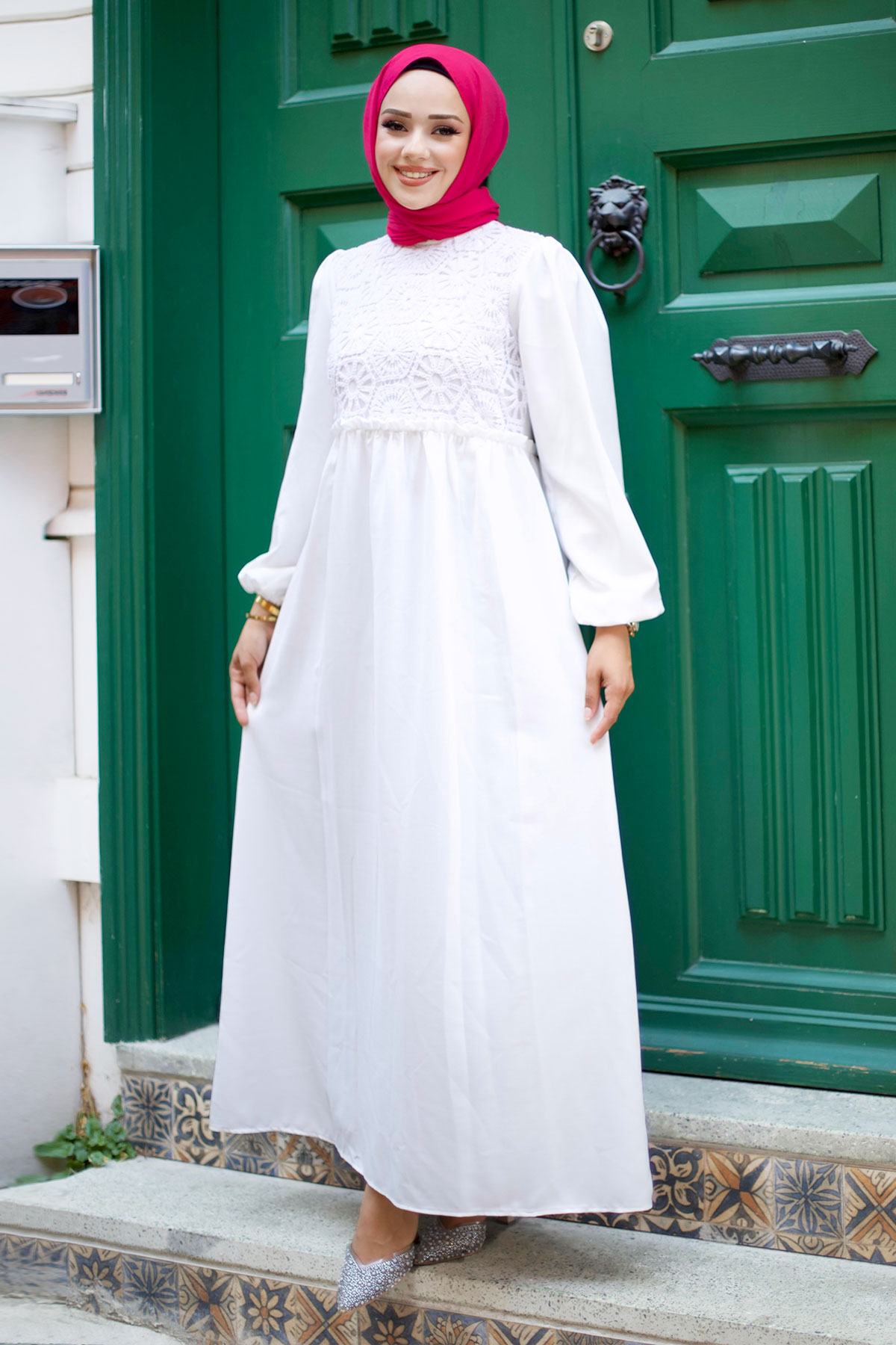 Önü Dantel Detaylı Tesettür Elbise TSD240519 Beyaz Özellikleri