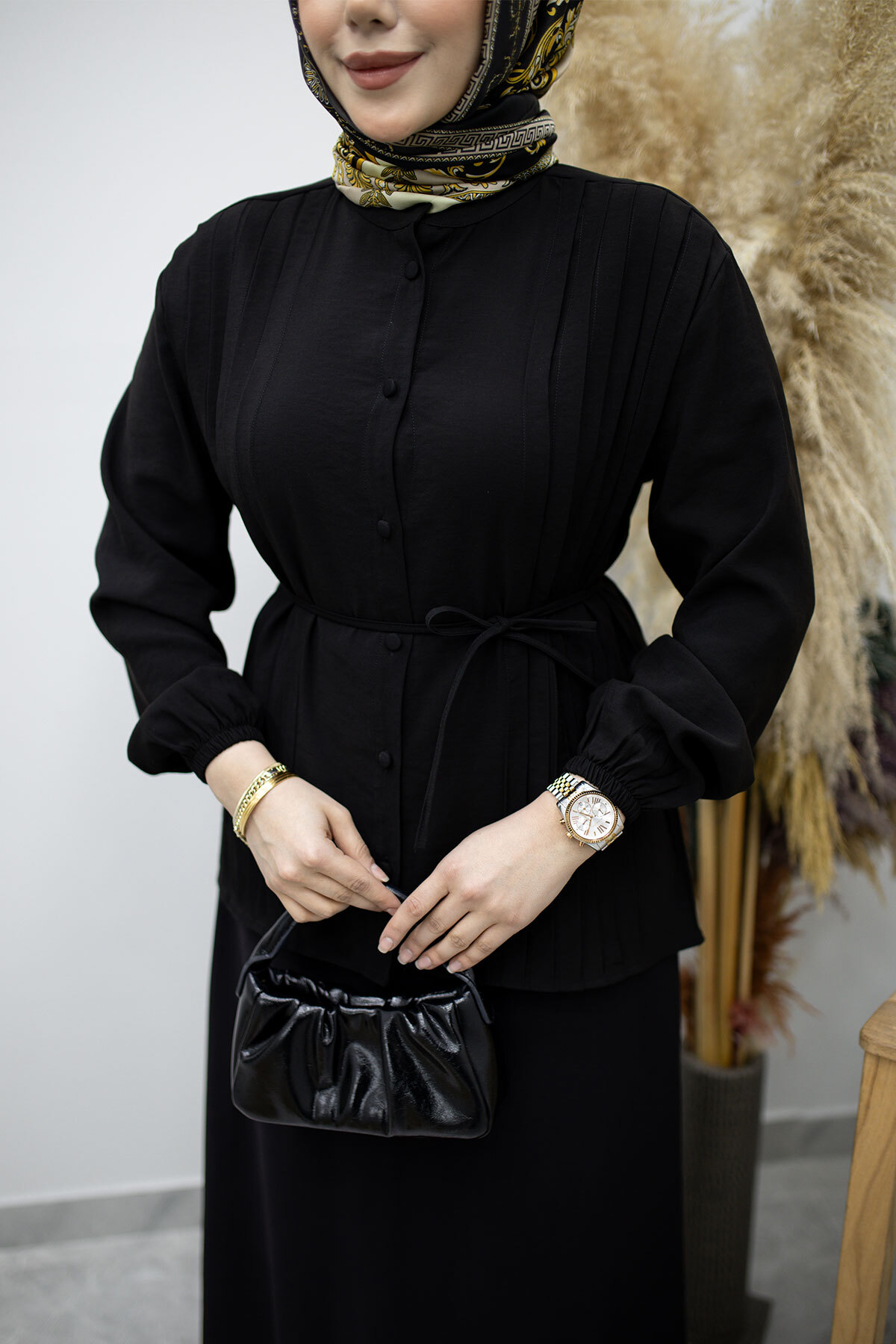 . Tunik düğmeli olmak ile birlikte ip detayı bulunmaktadır.